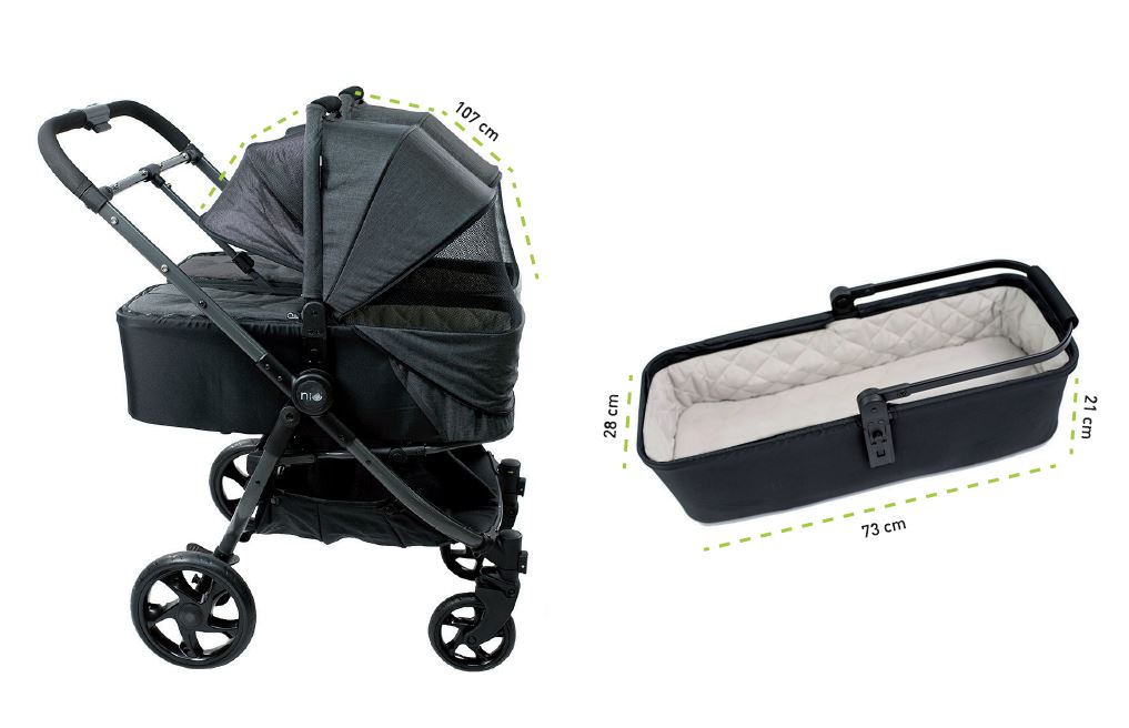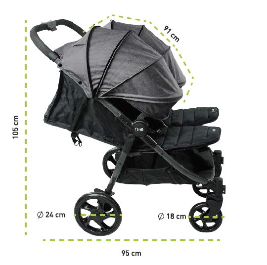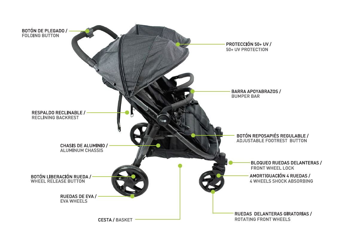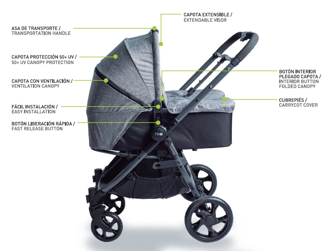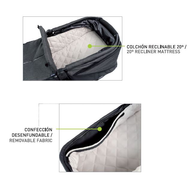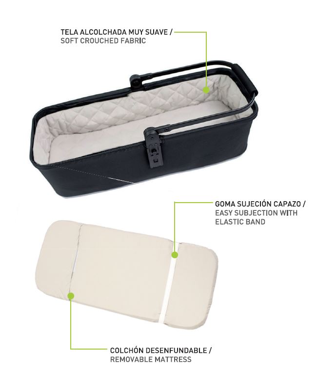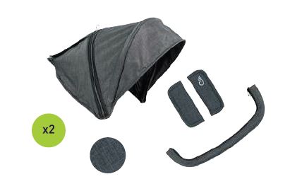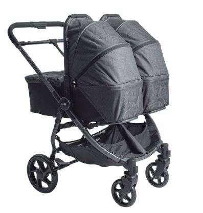 Pack que incluye – Estructura gemelar + 2 capotas + 2 capazos + 2 capotas de capazo